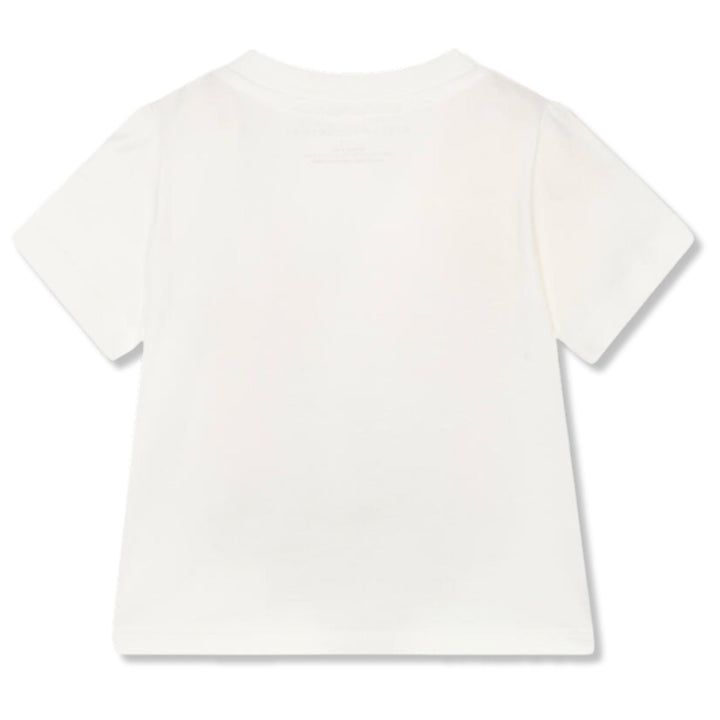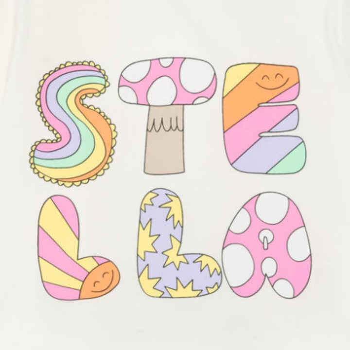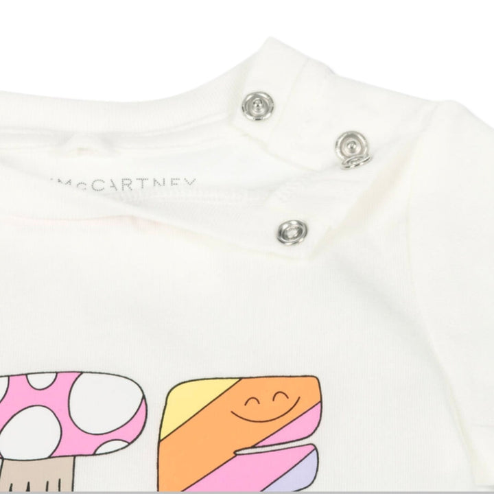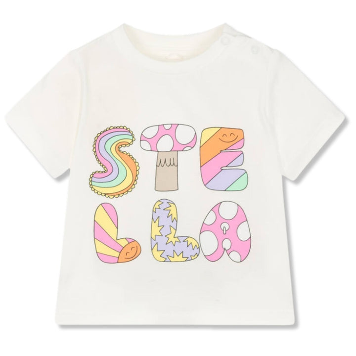 Baby girls ivory cotton T-shirt by Stella McCartney Kids, with a magical fairy and rainbows inspired logo print. Crafted in soft organic jersey, ideal for delicate skin. This casual top has popper fastenings on one shoulder, making it easier to dress little ones.