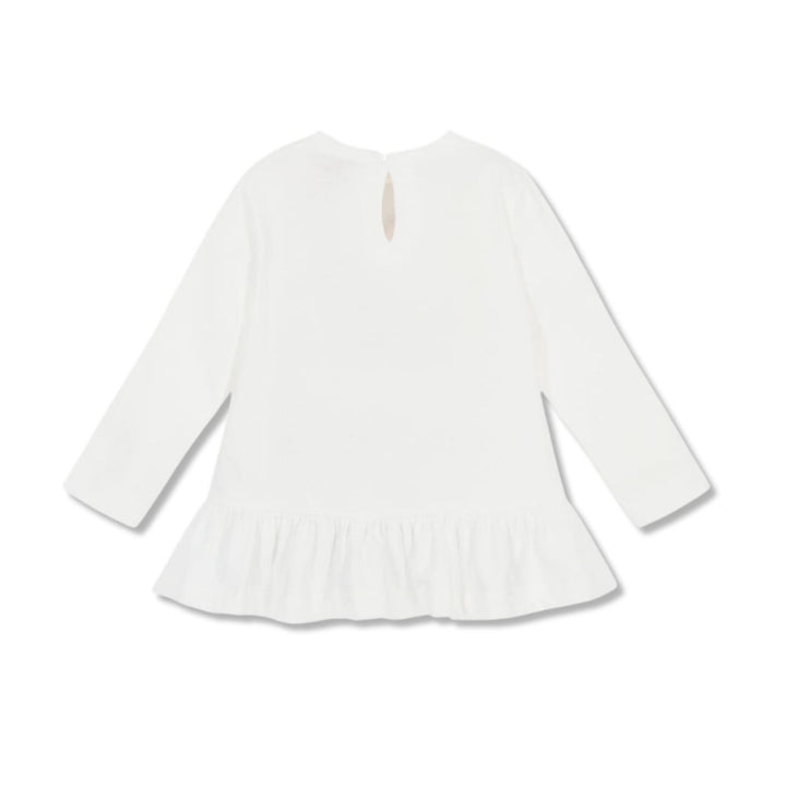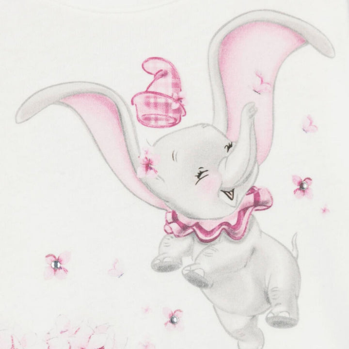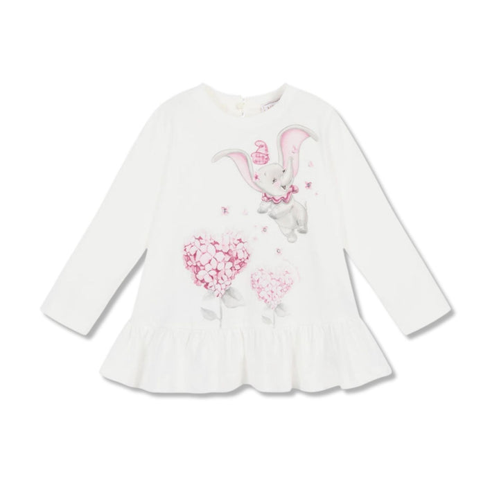 Ivory cotton tunic top for baby girls by Italian brand Monnalisa. Disney character Dumbo is printed on the front, with floral hearts in pink and grey, and sparkling diamantés. Made in soft, comfortable jersey, it has long sleeves and a pretty, ruffl