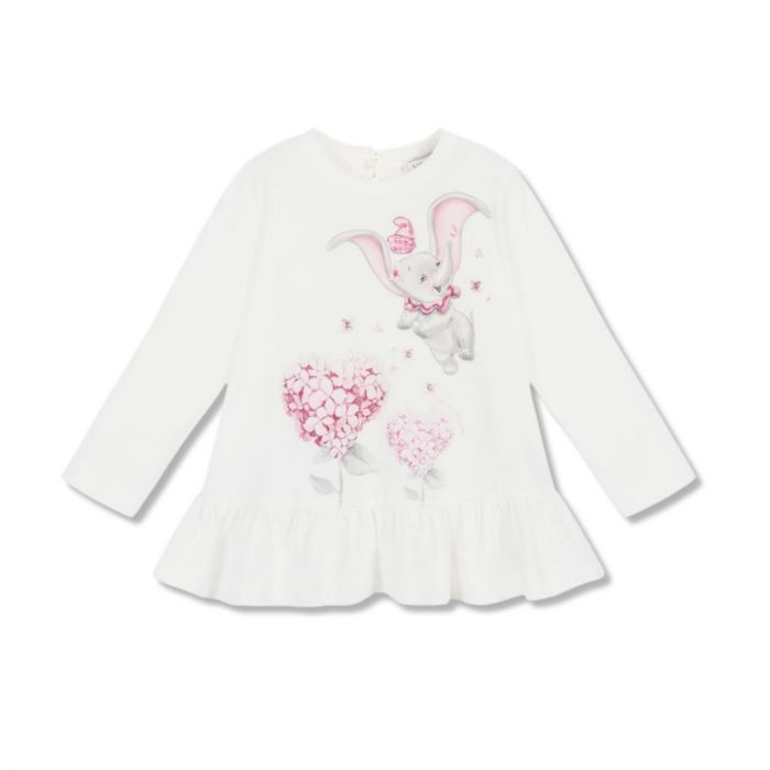 Ivory cotton tunic top for baby girls by Italian brand Monnalisa. Disney character Dumbo is printed on the front, with floral hearts in pink and grey, and sparkling diamantés. Made in soft, comfortable jersey, it has long sleeves and a pretty, ruffled hemline. There is a keyhole button fastening on the back.