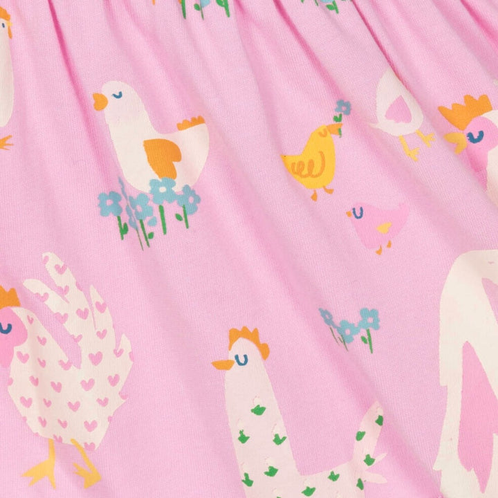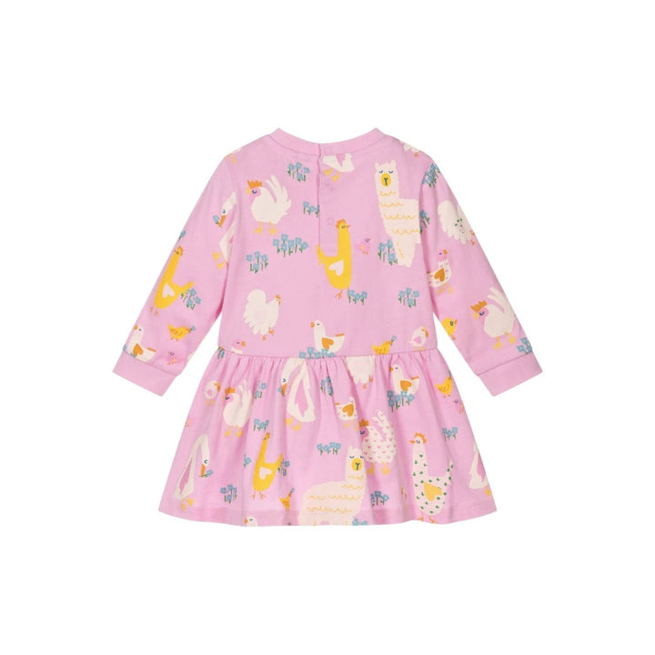 A lovely pink long-sleeved dress for baby girls by Stella McCartney Kids. Made from organic cotton in a soft jersey feel, it is printed with a delightful animal pattern, featuring alpacas, chickens, and geese. Fastening with poppers on the back, it has a gently gathered skirt for a pretty silhouette. The Stella McCartney fit can be quite small so choose a size up if you want room to grow.