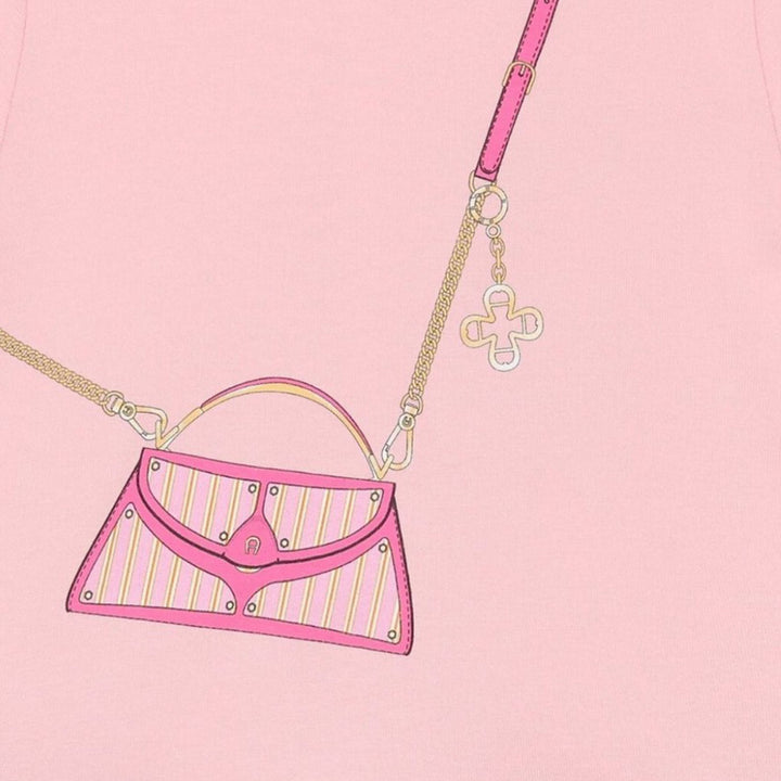 Pretty pink dress for baby girls by Aigner. Made from soft cotton jersey for comfort. This adorable design features a pink crossbody bag print on the front with the brands iconic horseshoe logo. The dress is beautifully finished with a charming layer