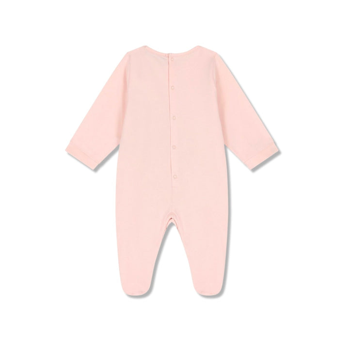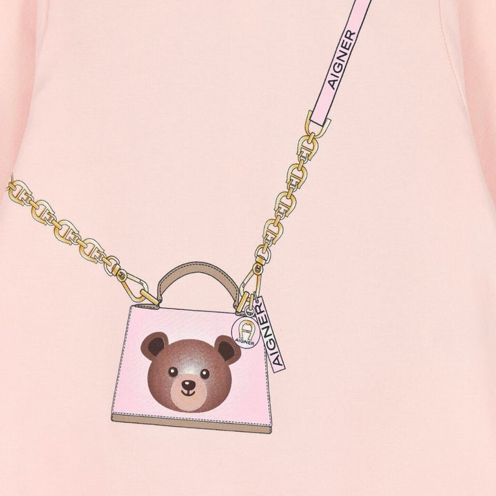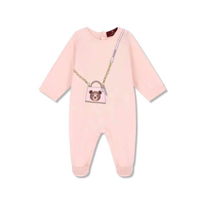 Pink logo bag romper for baby girls by Aigner. Made from soft cotton jersey, it features a lovely crossbody bag design on the front with the brands iconic horseshoe logo and brand name print. It fastens with poppers on the back and between the legs for easy dressing. Matching items are available for purchase separately.