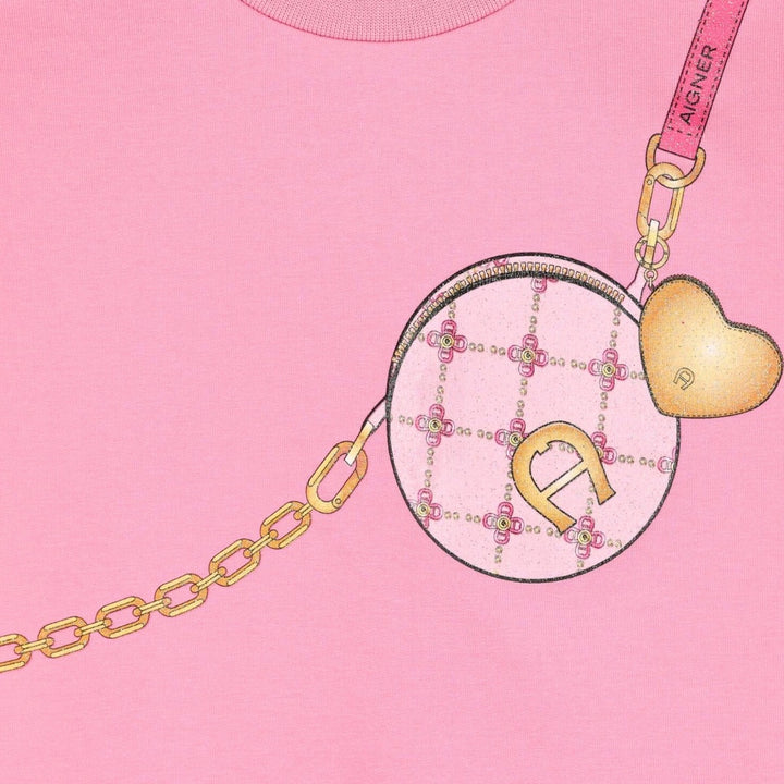 Pink logo bag sweatshirt for baby girls by Aigner. Made from soft cotton, it features a lovely crossbody bag print with the brands iconic horseshoe and sparkling glitter. The sweatshirt has a ribbed neckline, cuffs, and hem, and fastens with poppers at the back.