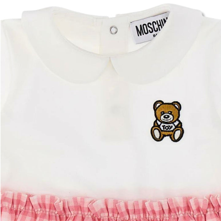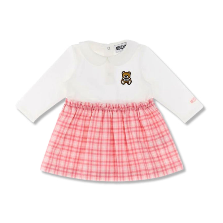 This Moschino pink jersey dress is made of soft cotton and features an embroidered bear patch on the chest. The skirt is adorned with a pink check print for an added touch of charm. Perfect for your little girl's wardrobe.