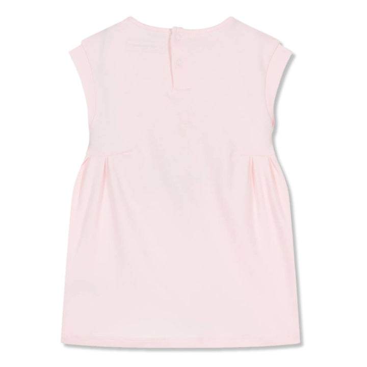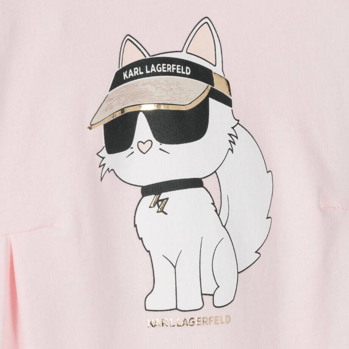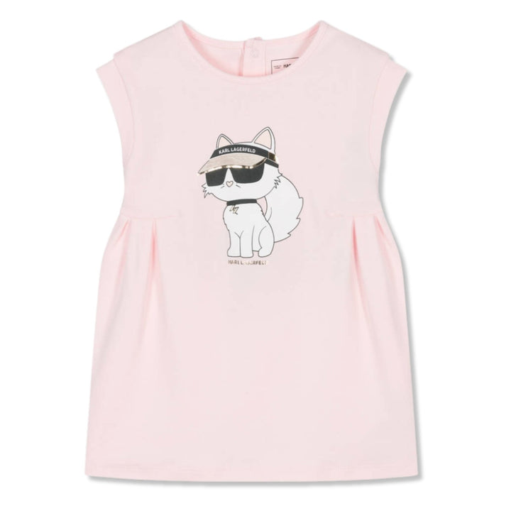A pretty pink dress for little girls by KARL LAGERFELD KIDS, made in soft cotton jersey. This lovely sleeveless dress has pleated sides to create a modern silhouette and is finished with a cool Choupette cat print.