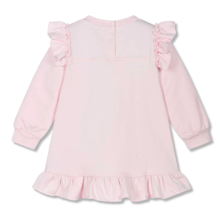 A delightful pink sweatshirt dress for younger girls by Monnalisa, made in soft cotton jersey with a warm, fleecy inside. This cosy style features Disney's adorable Dumbo character on the front detailed with sparkling diamantés. It has lightly ribbe