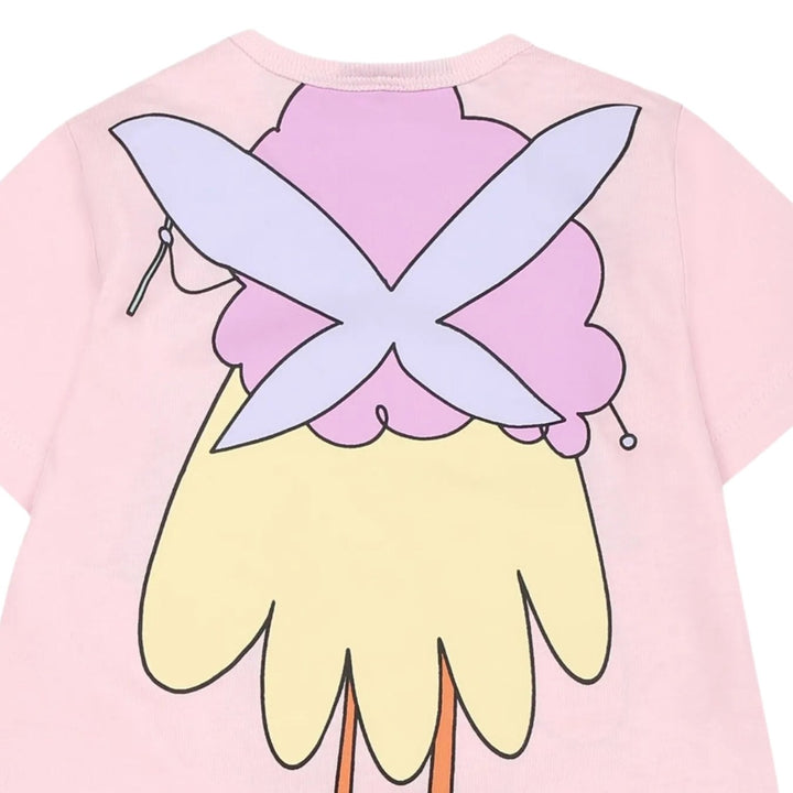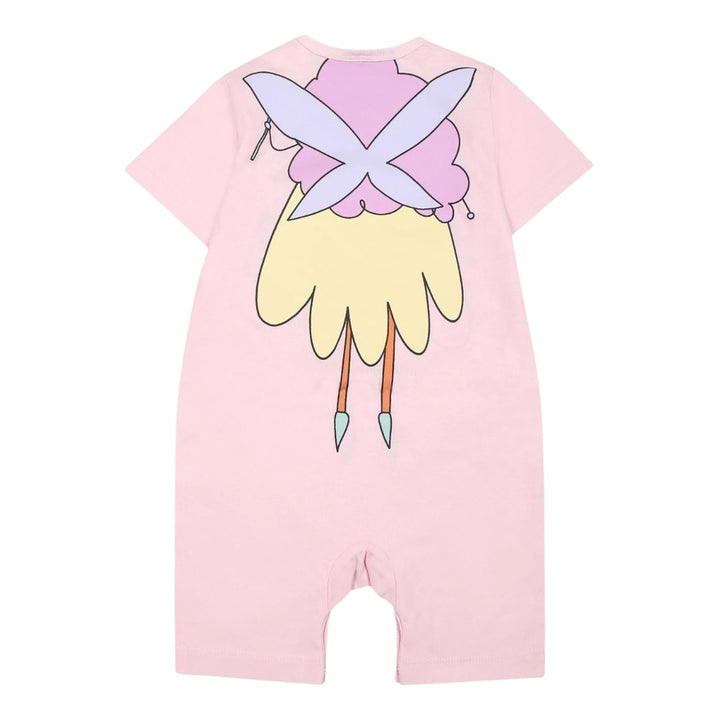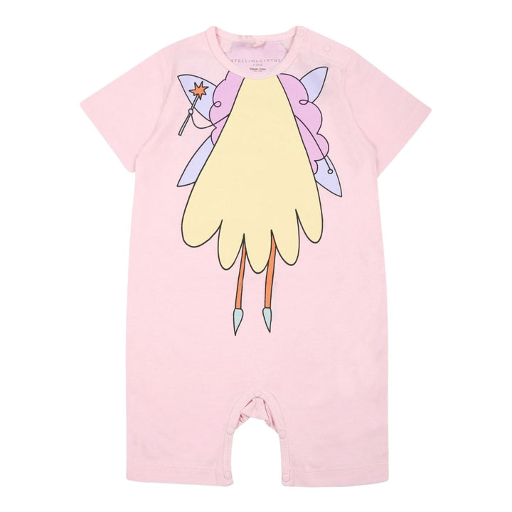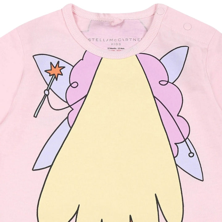 This adorable baby romper from Stella McCartney Kids features a playful fairy graphic on the front, giving the illusion of wings and a whimsical outfit when worn. Made from soft organic cotton, this pink short-sleeved romper is gentle on delicate skin and ensures all-day comfort. It comes with snap closures at the shoulder and bottom for easy dressing and diaper changes. A charming and fun piece for little ones who love a touch of magic.