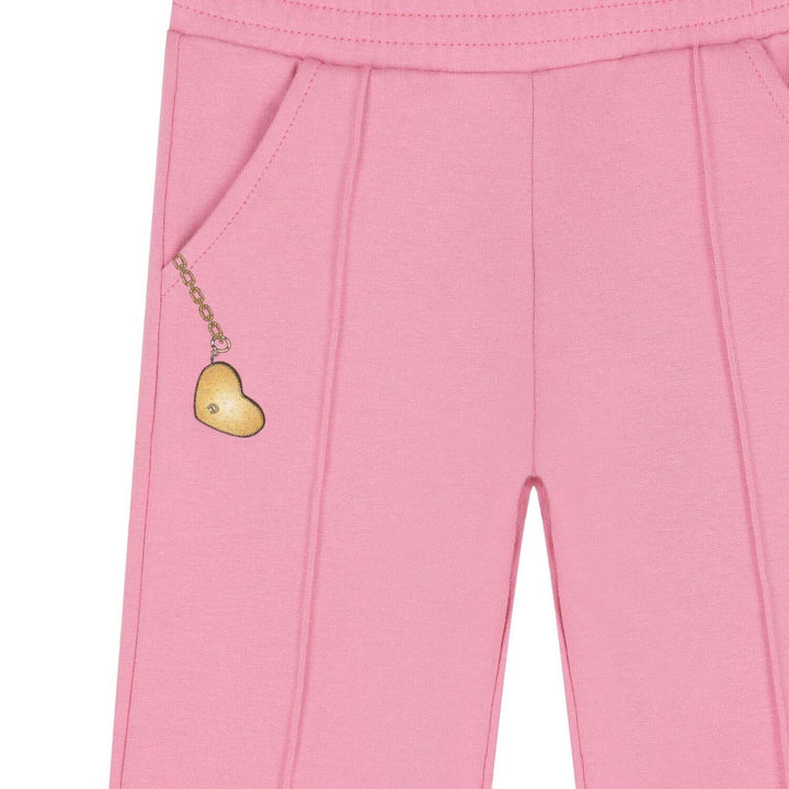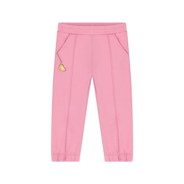 Pink logo joggers for baby girls by Aigner. Made from soft cotton, they feature a glittery gold heart charm print on the side, stitched front seams, and dual side seam pockets. Finished with an elasticated waistband for a comfortable fit.