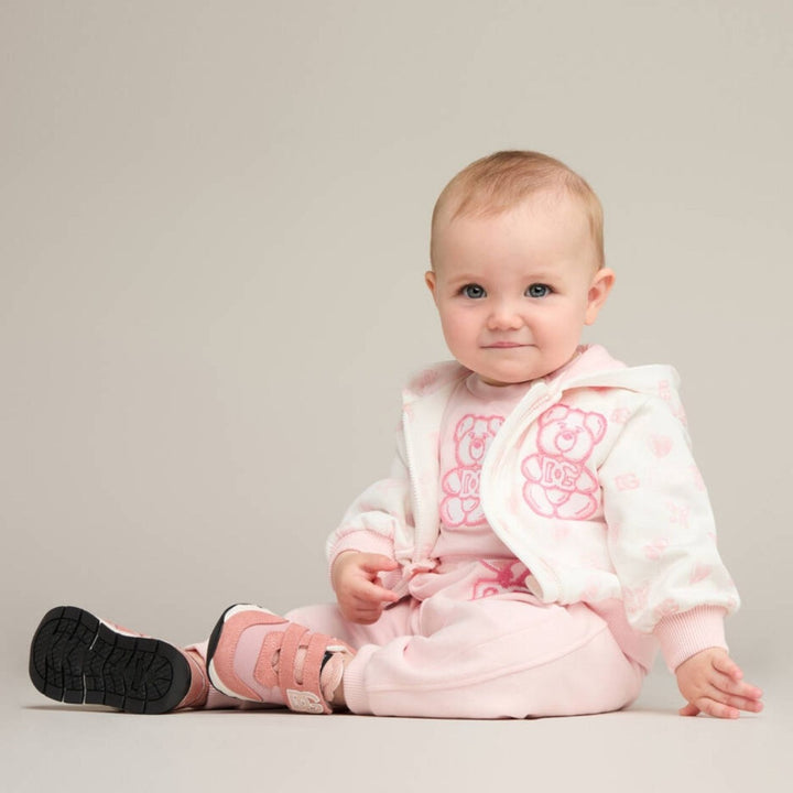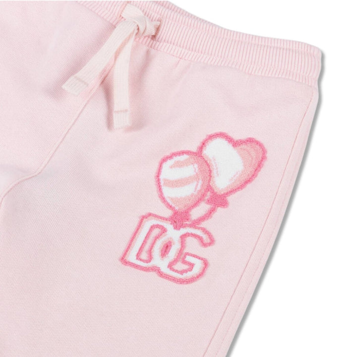 Cute and casual for little girls, a pair of pink cotton joggers from Dolce & Gabbana. Made in comfortable, mid-weight jersey with a drawstring waist, they feature a lovely embroidered DG logo and balloon applique on the front.