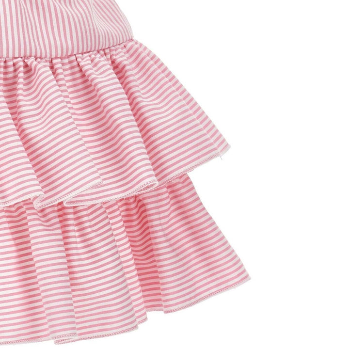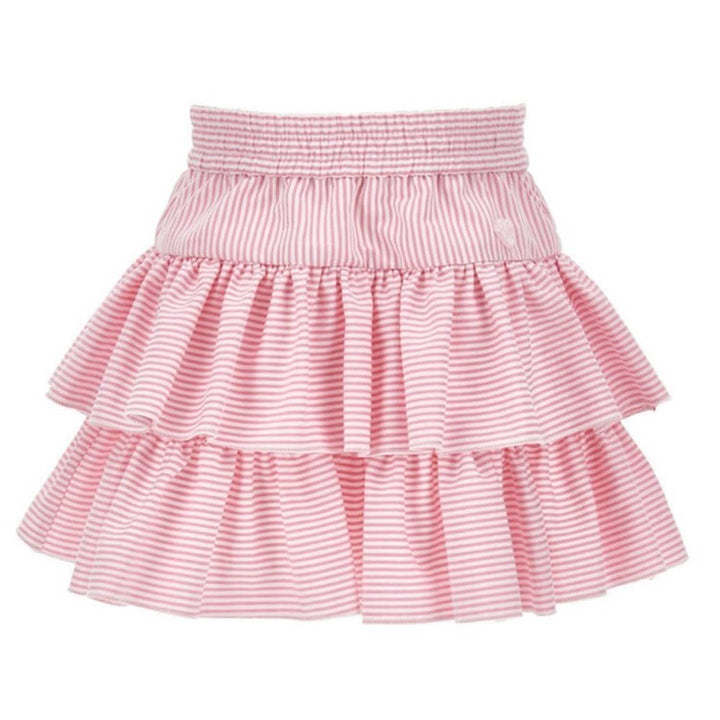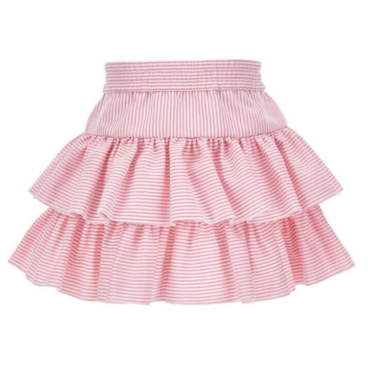 Girls pink flounces in striped skirt with soft elastic insert at the waist and logo heart with muslin lining .