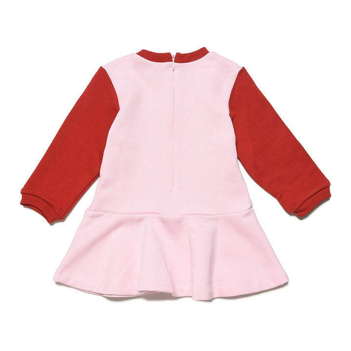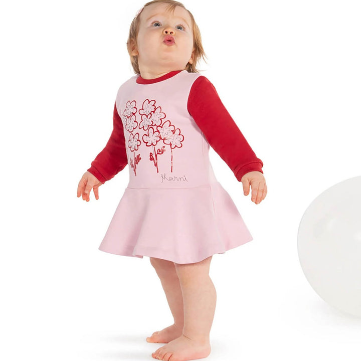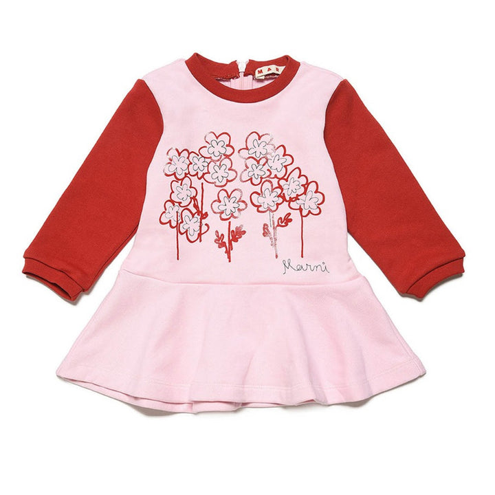 Long-sleeved dress, in fleece with contrasting collar and sleeves. It features a "little flowers" print on the front accompanied by the cursive Marni logo and a full skirt on the bottom.
