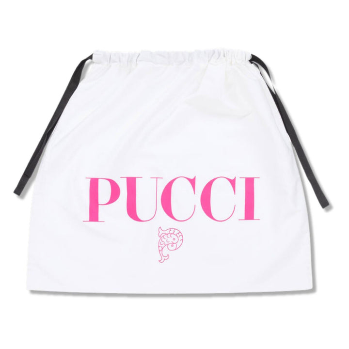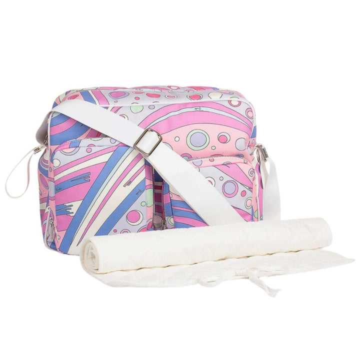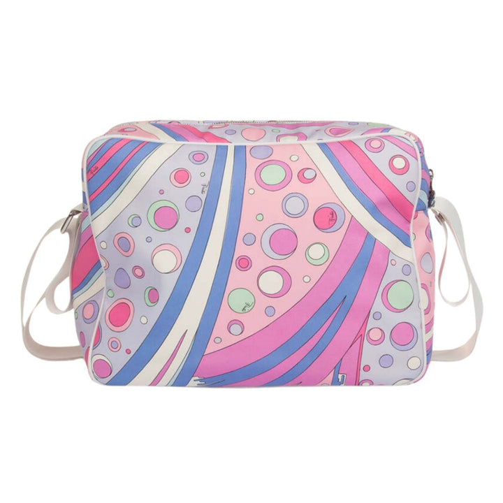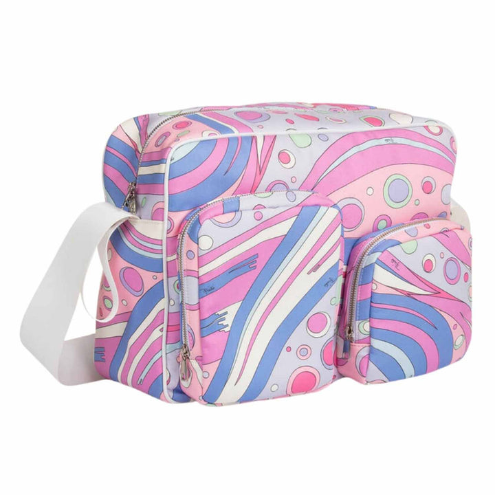 In shades of pink, lilac and blue, this beautiful changing bag from PUCCI is patterned in the luxury label distinctive Fontane print. Designed for stylish organisation, it has a lined, spacious compartment with elasticated internal pockets and furthe