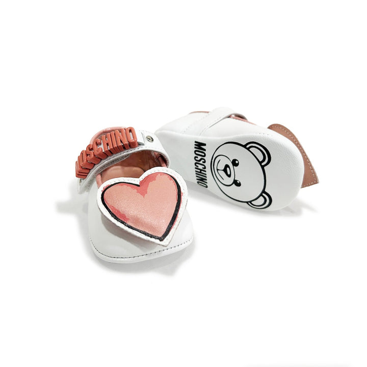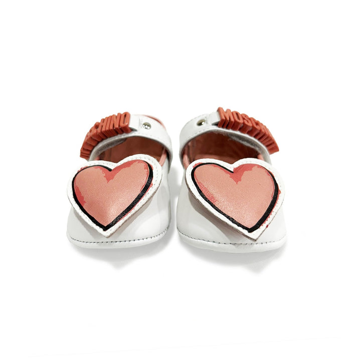 Pink pre-walker shoes for girls by Moschino Baby, made with luxuriously soft and supple leather. These ballerina-style shoes have the pink heart on the front for a cute look.
