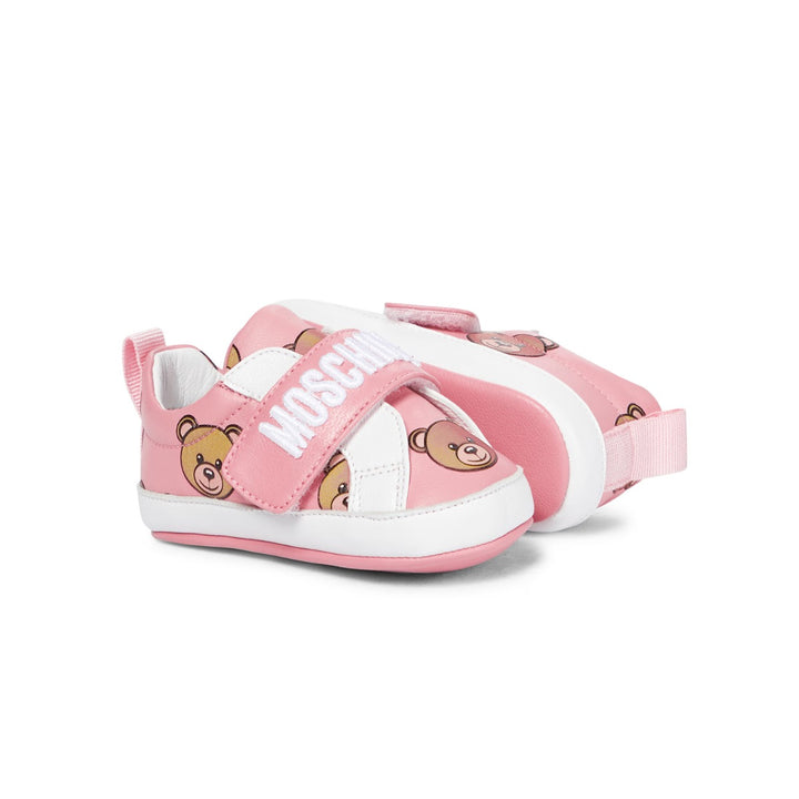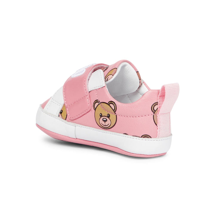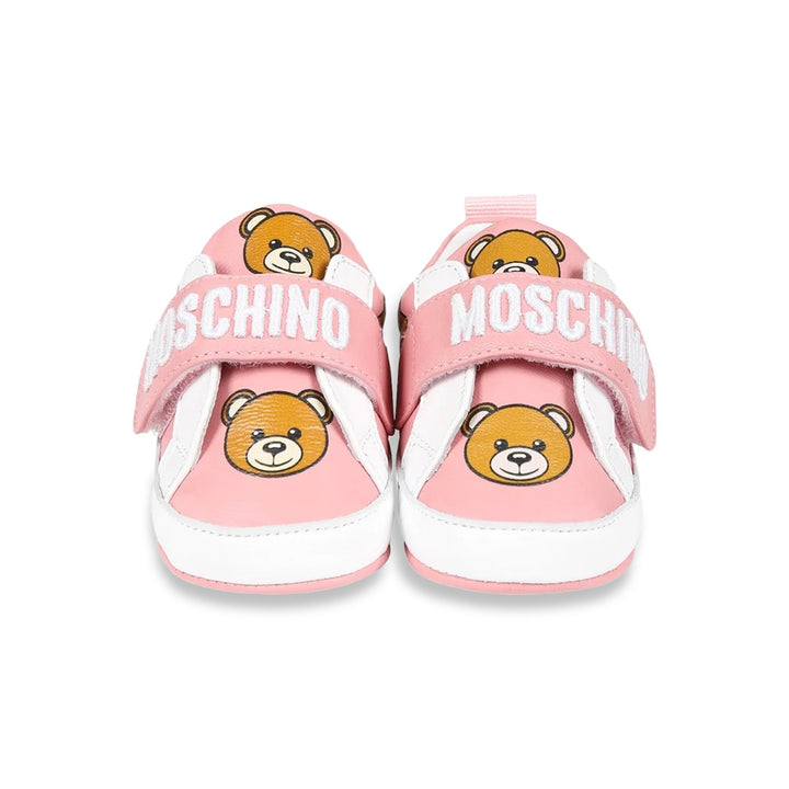 Cute white and pink pre-walker shoes for baby girls by Moschino Baby. They are fully made in soft leather and have a velcro fastening strap with logo embroidery. Further branding is printed on the flexible outsole and the adorable Moschino Teddy Bear is appliqued on the front.