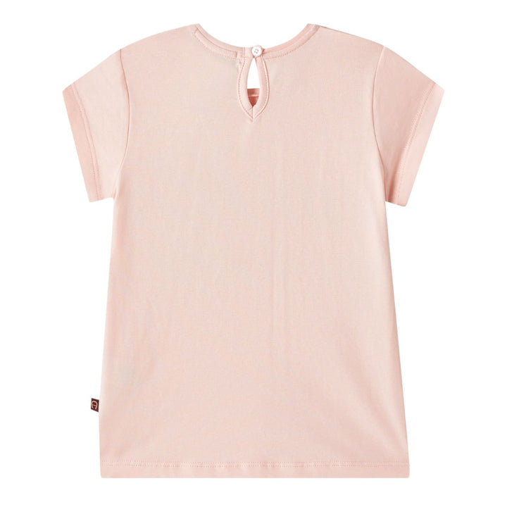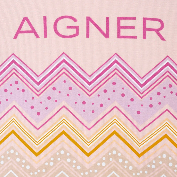 Baby girls pink cotton T-shirt by AIGNER, with cute capped sleeves. It has a blue logo on the front and stylish chevron stripes printed below. There is a simple button fastening on the back of the neck.