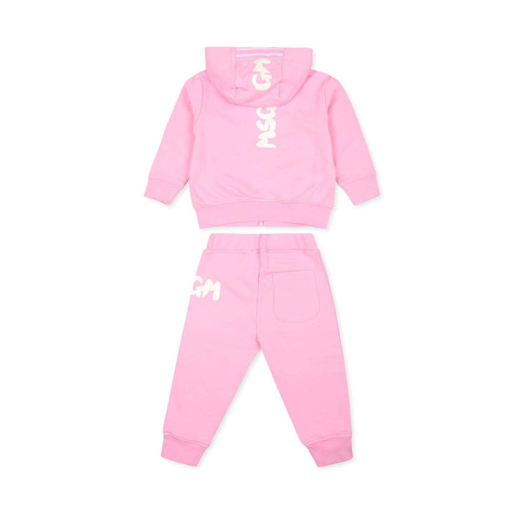 A bright Pink tracksuit for baby girls by MSGM, made from soft cotton jersey with a fleecy interior. The long-sleeved zip-up hoodie has faux pocket details on the front and black and white logo prints on the back. The joggers have a matching logo on one side, a patch pocket on the back, and a comfortable elasticated waist.