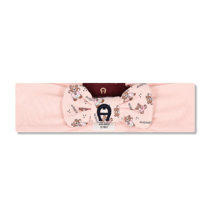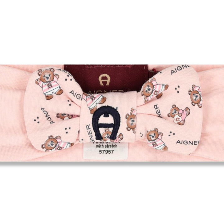 Pink headband for baby girls by Aigner. Made from soft cotton, it features a bow on the front with an embroidered brands iconic horseshoe in navy blue and a printed teddy bear pattern. Matching items are available for purchase separately.