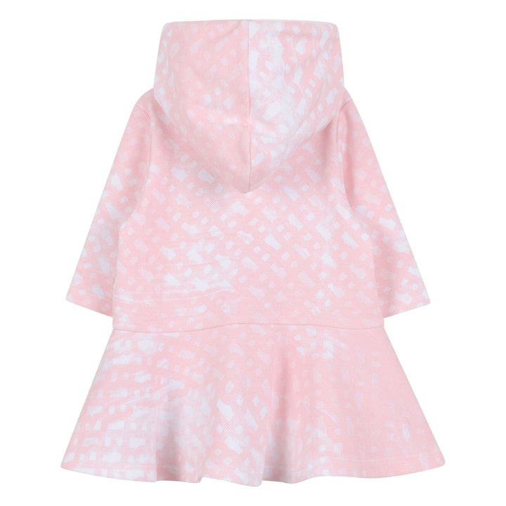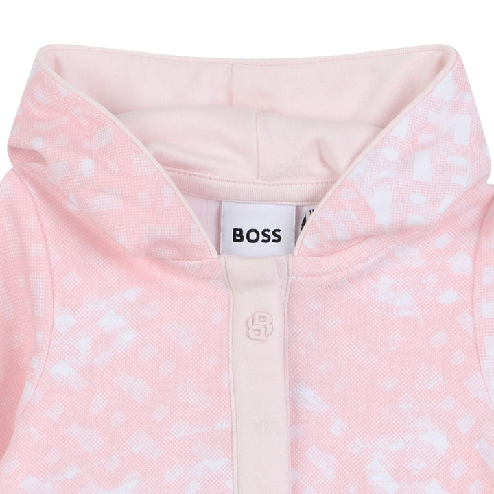 This pastel pink hooded dress from BOSS features a subtle, white spotted print throughout the fabric. It has long sleeves, a zip front closure, and a flared, skirted hem for added charm. The soft material ensures comfort, and the attached hood provid