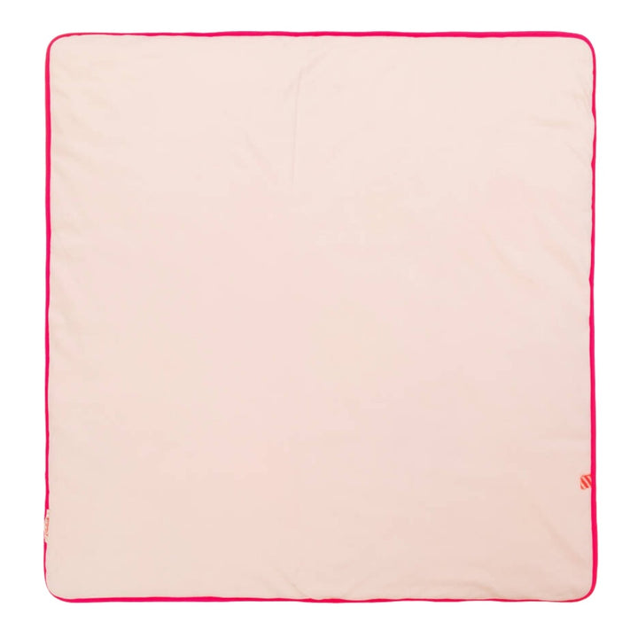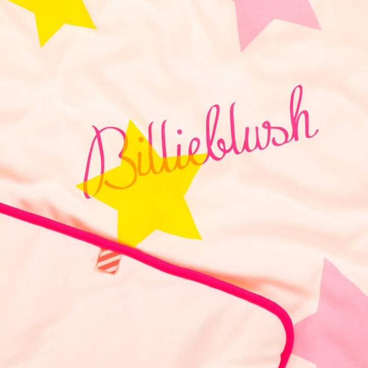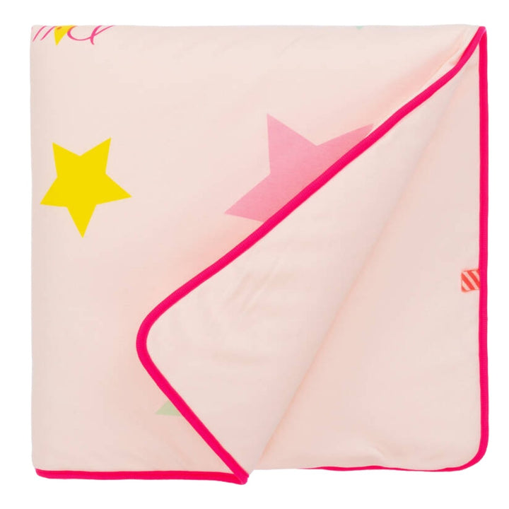 Pink blanket for baby girls by Billieblush, made in soft organic cotton jersey. Warmly padded, the front is decorated with colourful stars. It has a neon pink logo in the middle, with matching neon pink trims around the edge. It makes an ideal nurser