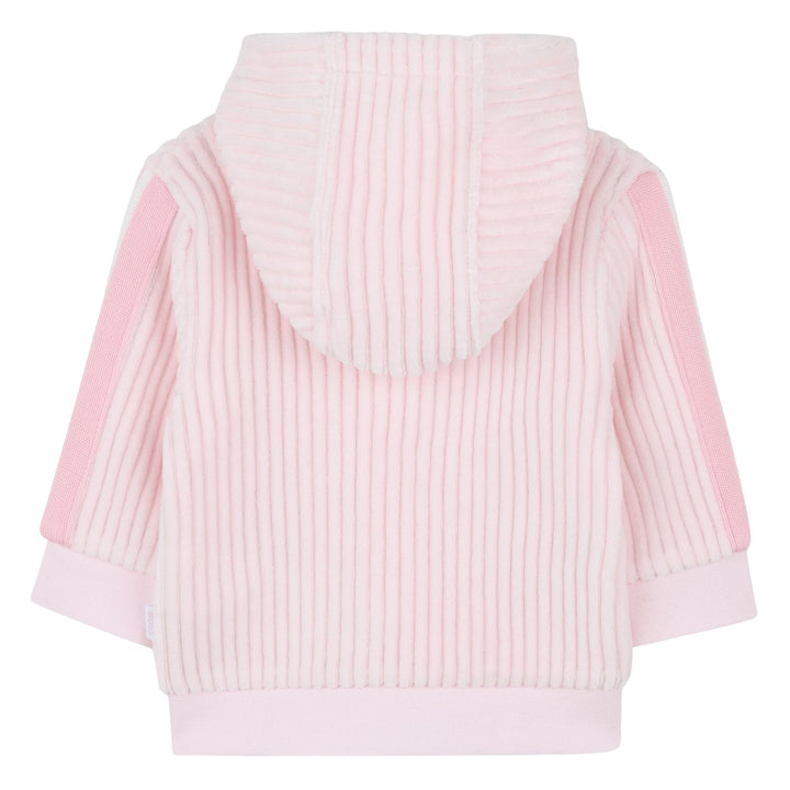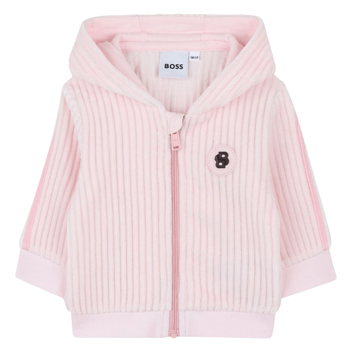 This soft pink tracksuit from BOSS includes a ribbed zip-up hoodie and matching jogger pants. The top features a comfortable hood, front zipper, and a small "B" logo patch on the chest, while the pants have a gentle ribbed texture, striped waistband,