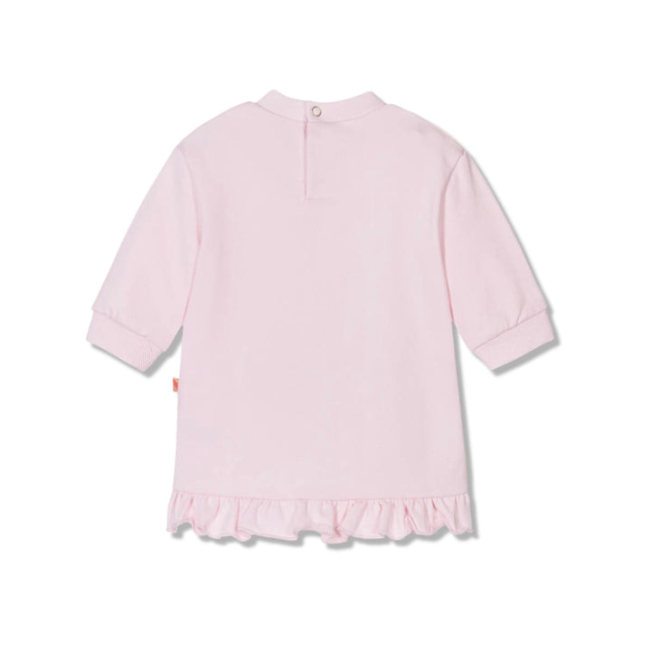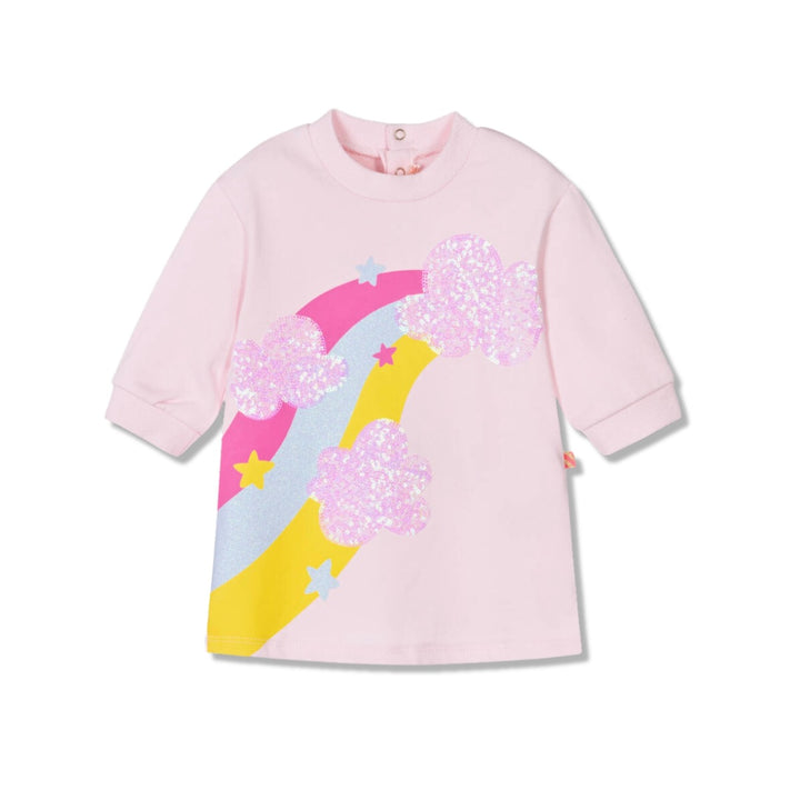 Pale pink dress for baby girls by Billieblush, made in comfortable, mid-weight cotton jersey. A glitter rainbow, stars and sequin clouds decorate the front, adding fun sparkle and shimmer. This long-sleeved dress has ribbed cuffs, with easy popper fastenings and a ruffle hem on the back. The brand's neon-coloured logo tab on the side seam completes the design.