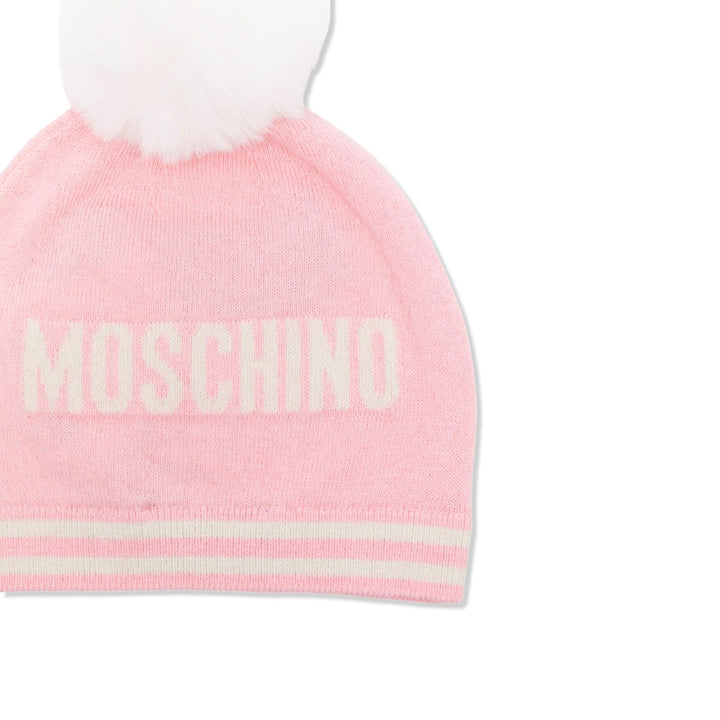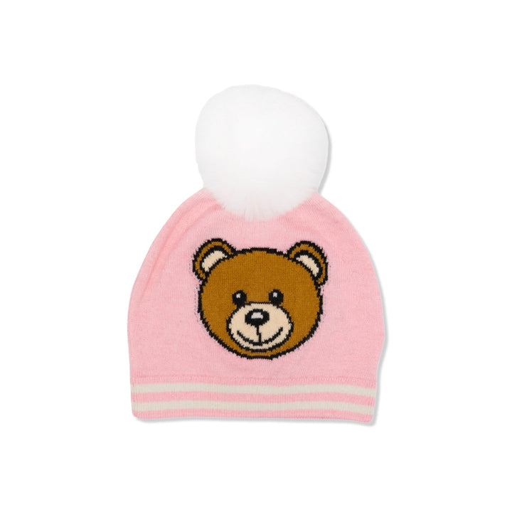 Pink hat for baby girls by Moschino Baby, knitted in a super soft blend of cotton and wool. It has an ivory striped trim and a cute Moschino Teddy Bear on the front for an instantly recognisable look. There is an ivory jacquard logo on the back and a fun white pom-pom on the top.