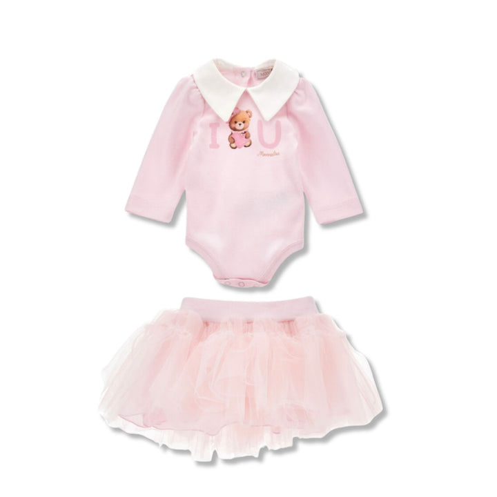 Set consisting of bodysuit with practical buttoning and collar, and chic tulle skirt.