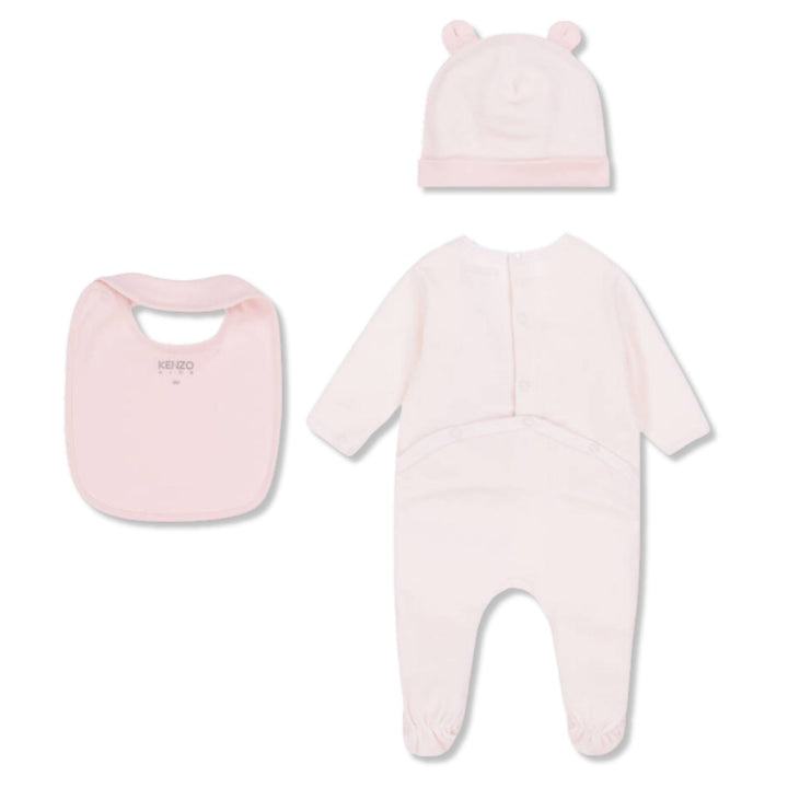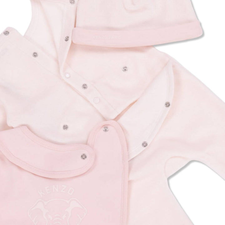Pale pink organic cotton babysuit set for girls by KENZO KIDS, featuring the brand's iconic Elephant motif. The set includes a cosy velour babygrow and matching hat with adorable ears, and a cotton jersey bib. With practical popper for fastening, the