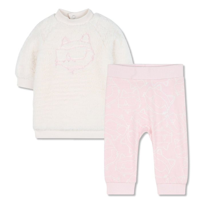 Cute pink and white leggings set for girls by Karl Lagerfeld, featuring a stylish logo design and soft cotton comfort.