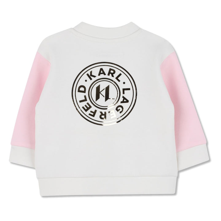 Chic pink and white logo-print tracksuit for girls by Karl Lagerfeld, made from soft cotton for a stylish and comfy fit.