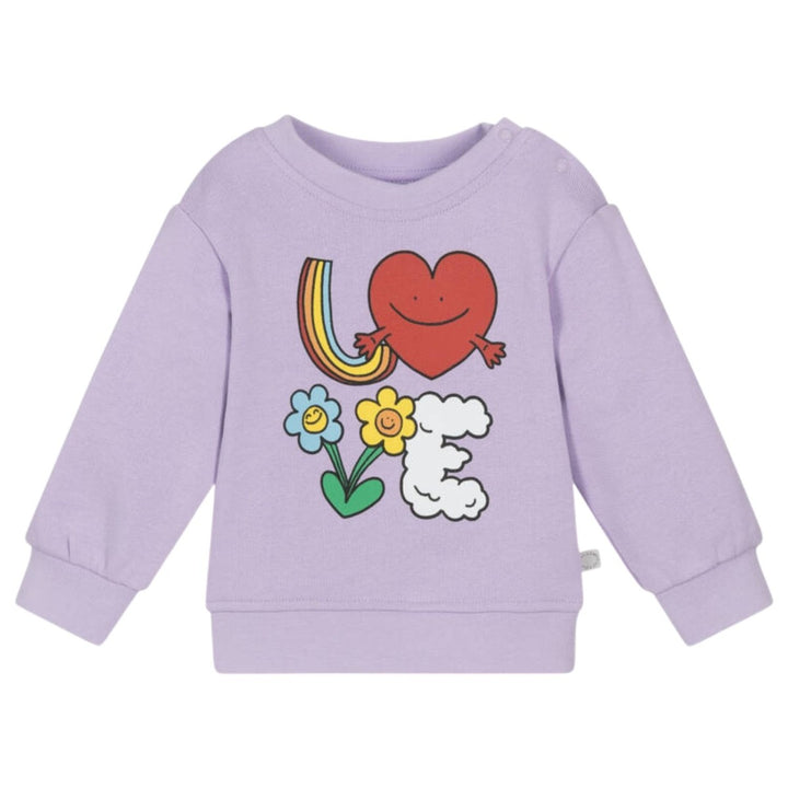 Lilac purple sweatshirt by Stella McCartney Kids is a lovely wardrobe addition for little girls. Featuring a playful design with a cheerful heart and flower print, making the word love. Crafted from soft cotton jersey, it offers comfort and warmth, ideal for cooler weather. The ribbed cuffs and hem provide a snug fit, while the shoulder popper fastenings ensure easy dressing.