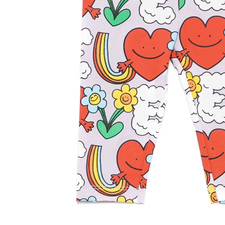 Lilac purple leggings for little girls by Stella McCartney Kids, made in soft cotton jersey for comfortable wear. Adding a splash of colour to any outfit, they are patterned with a playful design of happy hearts and rainbows.