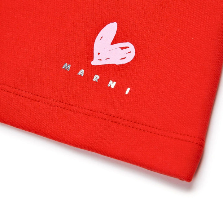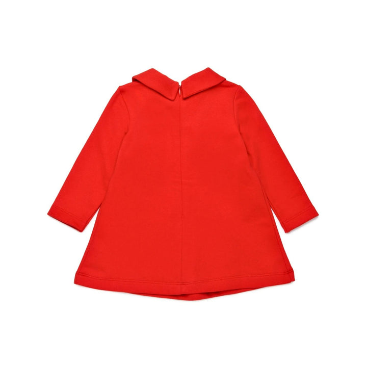 Long-sleeved crew-neck fleece dress. Small box pleat on the front. Contrasting colour heart with silver mylar institutional logo on the bottom. Zip closure at the back. Made of 1% cotton. An easy-to-match romantic option.