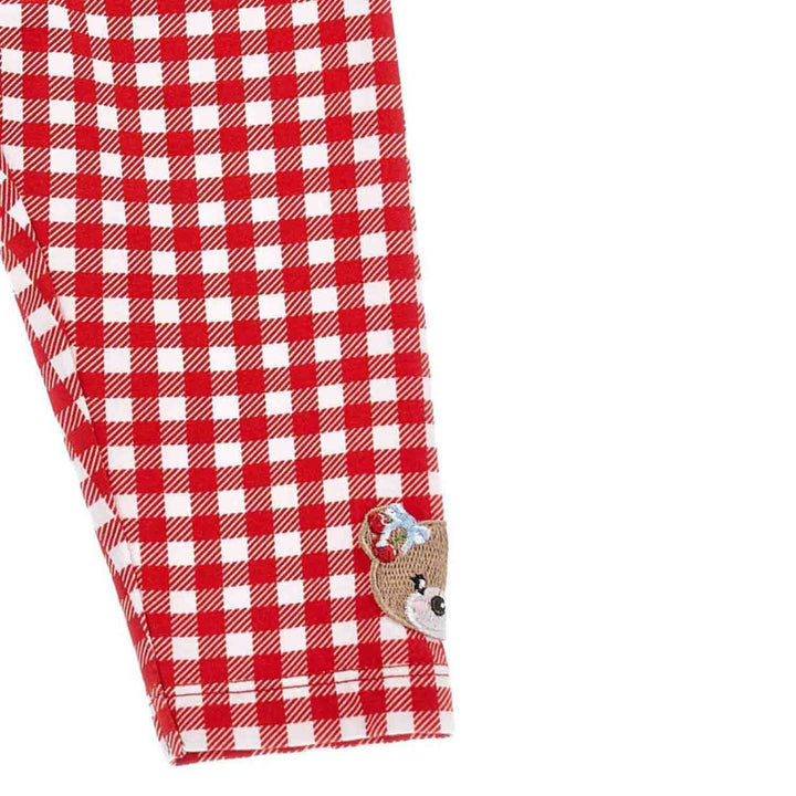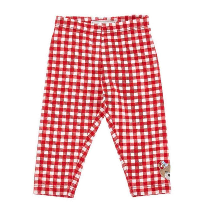 Cute red gingham leggings for baby girls by Monnalisa, beautifully embroidered with a sweet teddy bear on one leg. Made in soft cotton jersey, they have an elasticated waist for gentle comfort on little tummies.