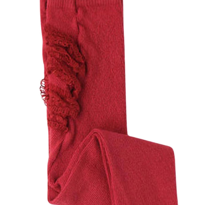 These red tights feature adorable ruffle detailing for a charming look. Made from soft, stretchy fabric, they ensure a snug and comfortable fit perfect for pairing with dresses and special outfits.