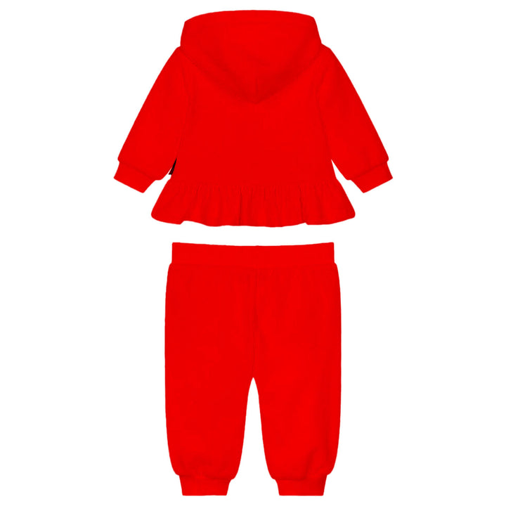 A vibrant red tracksuit featuring Moschinos iconic teddy bear logo, crafted from soft cotton jersey for comfort. The zip-up hoodie and matching joggers offer a coordinated look.