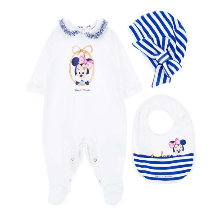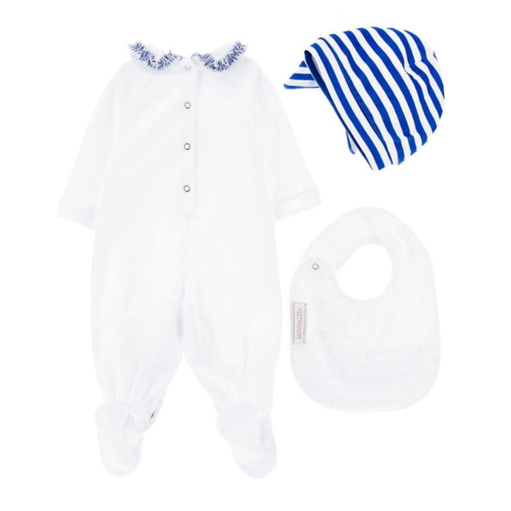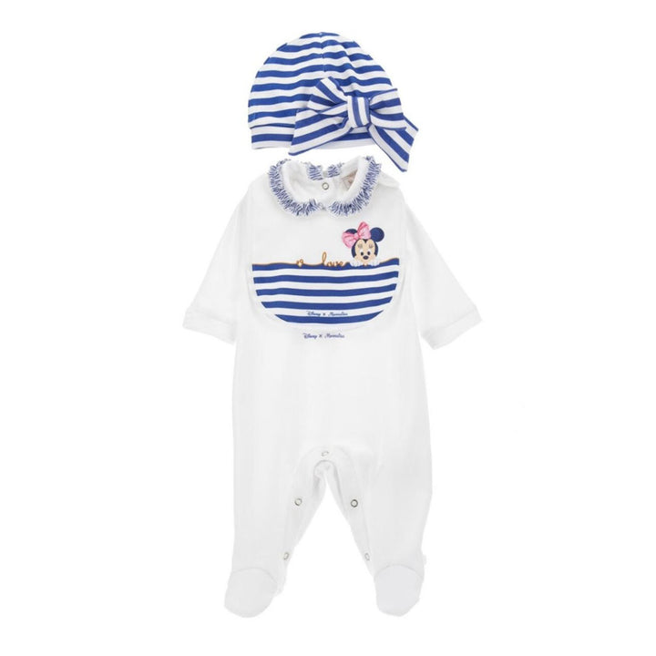 Newborn set consisting of one-piece suit, striped bib and jersey cap.