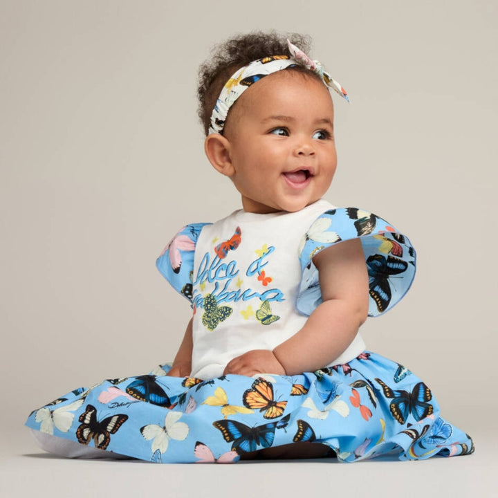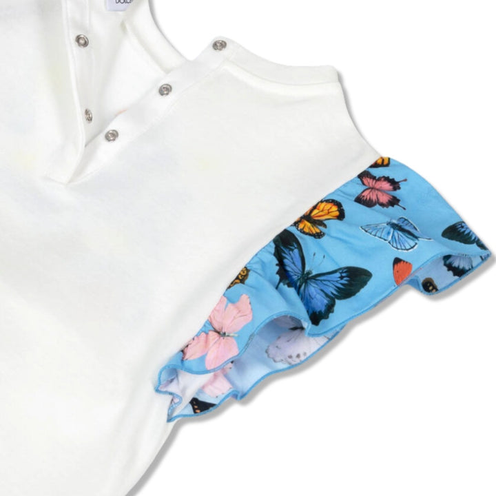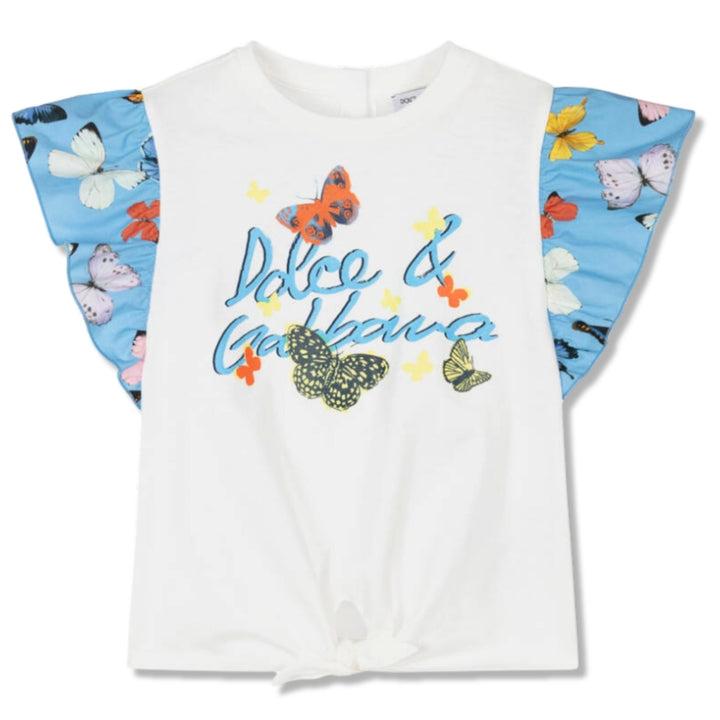 White and blue T-shirt for little girls by luxury Italian label, Dolce & Gabbana, with an eye-catching butterfly logo design. Made from soft cotton jersey with a playful butterfly print on the ruffled poplin sleeves, it is both comfortable and stylish for casual wear. A charming knot tie at the hem completes the delightful look and popper fastenings allow for easy dressing.
