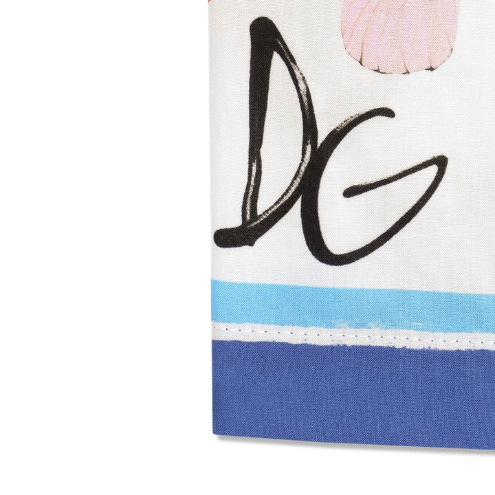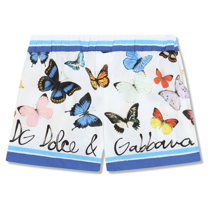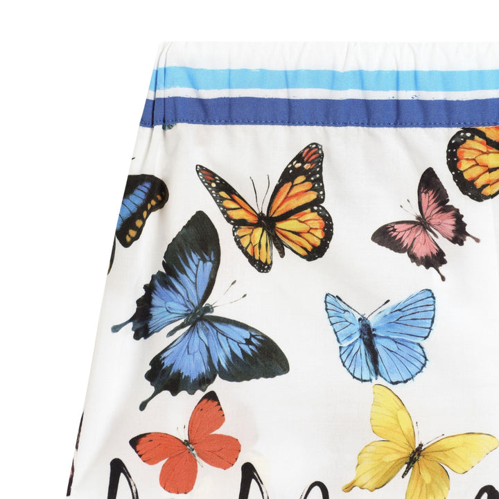 Fabulous white cotton shorts for baby girls by luxury brand Dolce & Gabbana, with a delightful, colourful butterfly print. Designed with stripes in shades of blue, along with blue piping and slanted pockets, they are made and lined in soft, lightweig