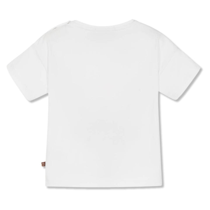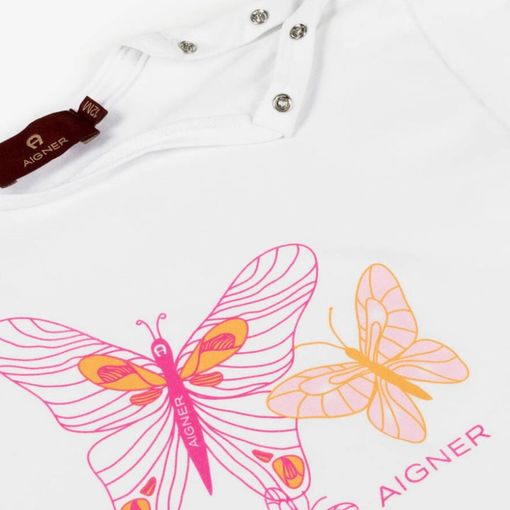 Comfortable white cotton T-shirt for baby girls by AIGNER, made in soft, stretchy jersey. It has a pretty butterfly and logo print on the front in shades of pink and pale orange.