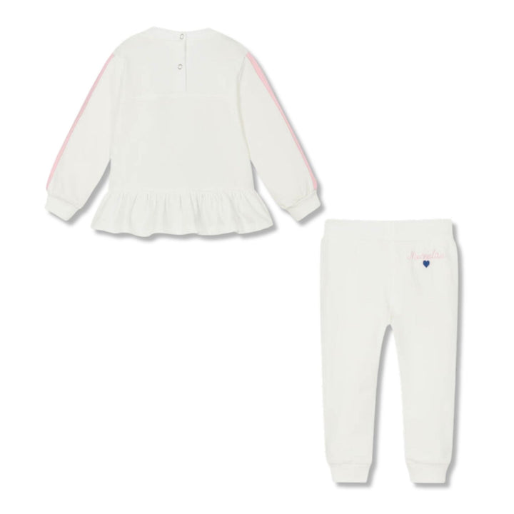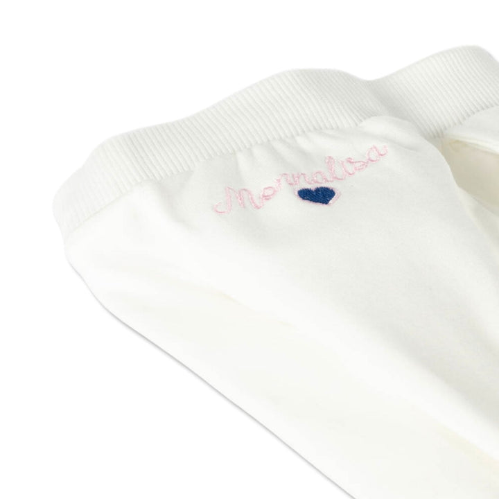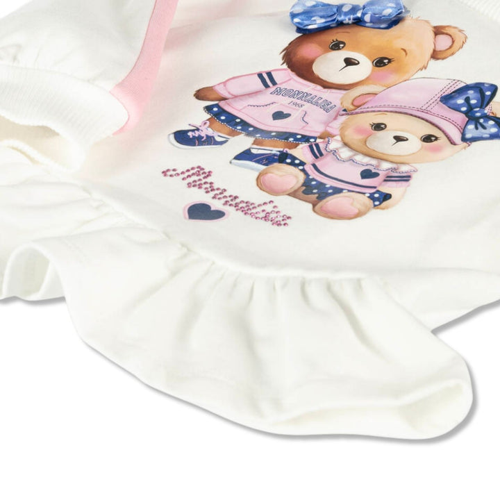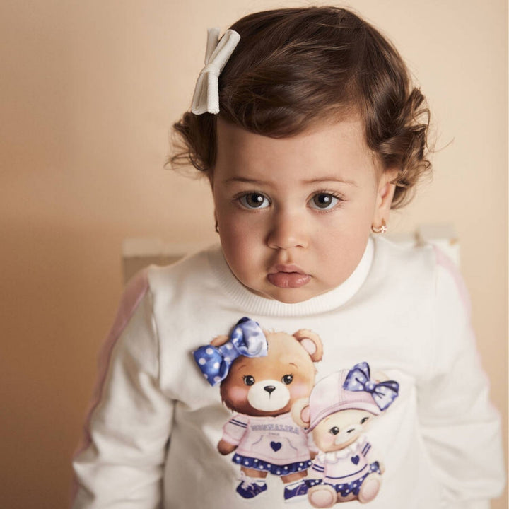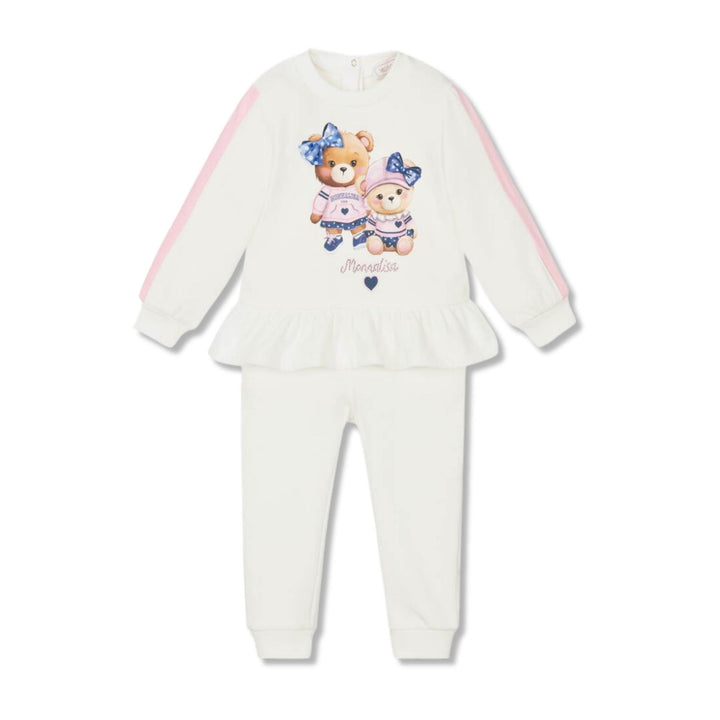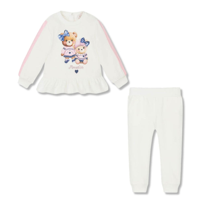 A white cotton jersey tracksuit for little girls by Monnalisa, with a cosy fleecy inside. The sweatshirt has a frilled hem and two adorable teddy bears on the front, one with a 3D dotted bow on her head. There is a sparkly pink logo on the front and