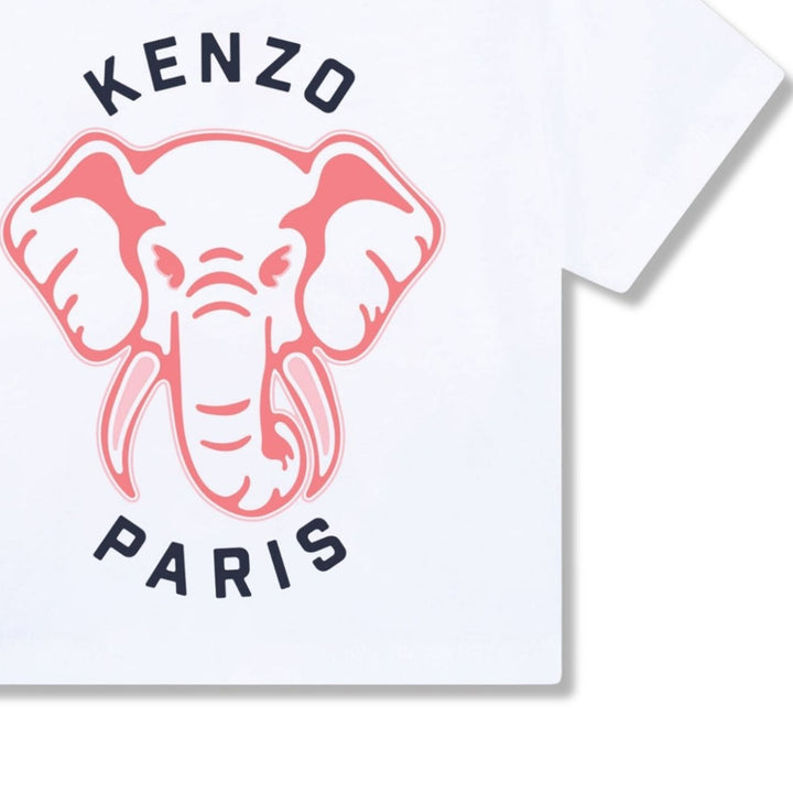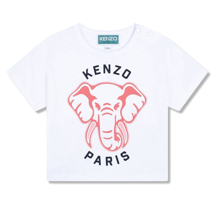 A white T-shirt for baby girls by KENZO KIDS, made in soft cotton jersey with a relaxed fit. This short-sleeved tee is printed with black lettering and the iconic Elephant motif, a signature design from the French brand. It has a gently ribbed neckli