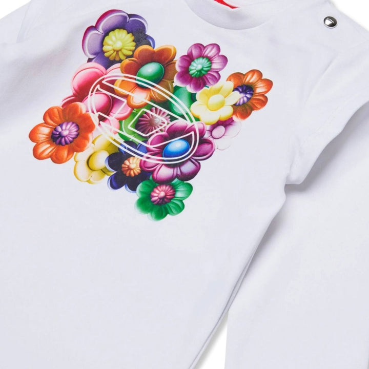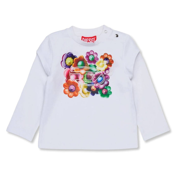 Diesel baby girls white T-shirt with a charming flower print. Made from a soft and stretchy blend of 93% cotton and 7% elastane for all-day comfort. Sweet, stylish, and perfect for everyday wear.