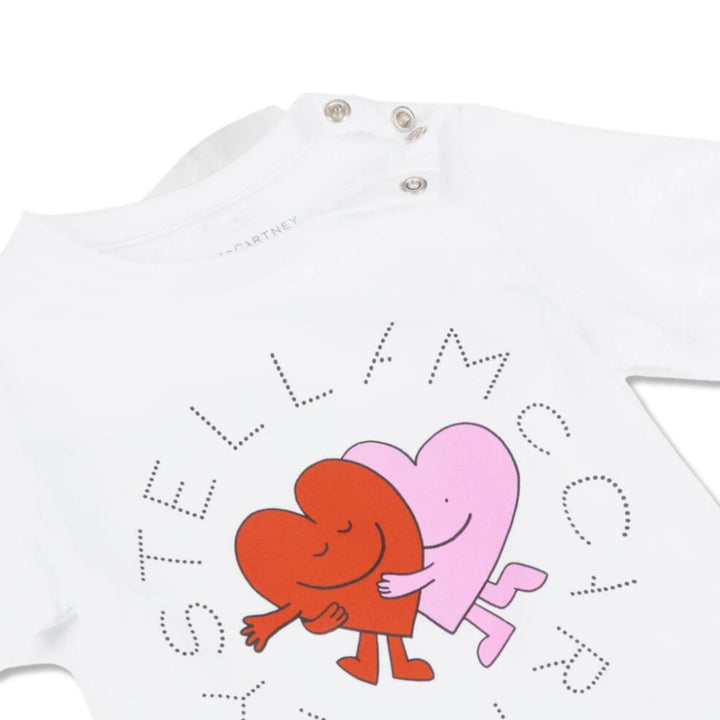 Fun white T-shirt for little girls by Stella McCartney Kids, made in soft organic cotton jersey. This casual, short-sleeved tee features a playful red and lilac purple heart graphic on the front along with brands signature circular logo. It has popper fastenings on one shoulder for easy dressing.