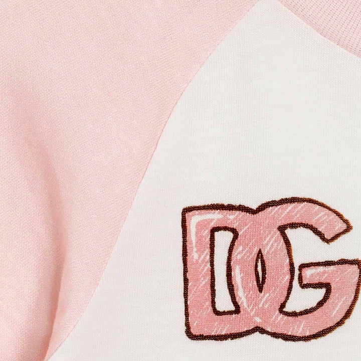 Dolce & Gabbana Kids white T-shirt featuring pink raglan sleeves, a bold leopard graphic, logo patch, and round neckline. Made in Italy from 100% cotton.