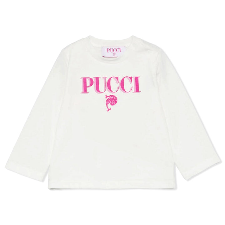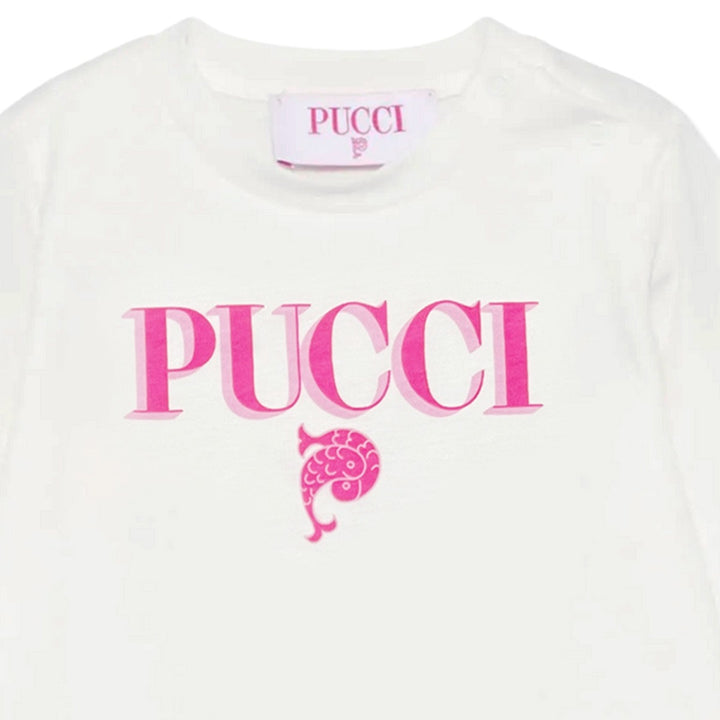 This girls white T-shirt from Pucci brings a fresh, stylish touch to everyday wear. Made from soft cotton, it features a vibrant multicolour Pucci logo printed across the chest, adding a signature pop of colour. With its classic crew neck and short sleeves, its a comfortable and versatile piece perfect for casual dressing.