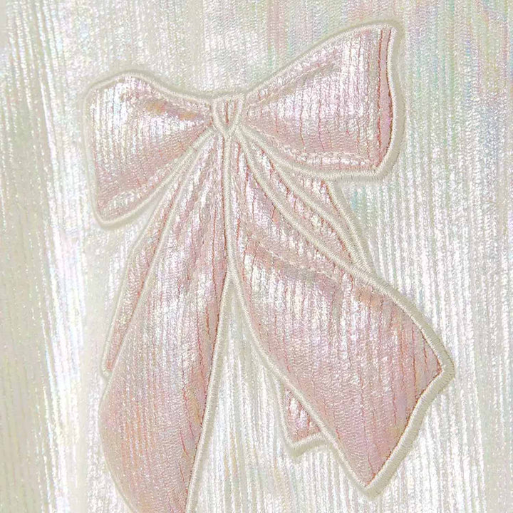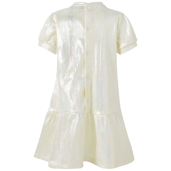 This charming white dress features a shiny metallic bow patch for a touch of sparkle. Crafted from a soft cotton blend, it offers both comfort and style perfect for special occasions or everyday elegance.