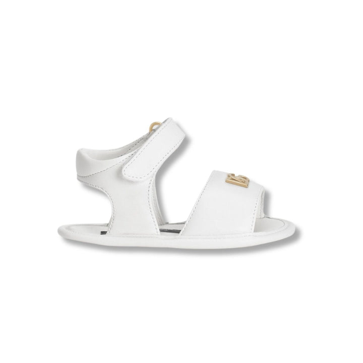 Pretty white sandals for baby girls by Italian luxury brand, Dolce & Gabbana. Beautifully made in soft patent leather, they have a pretty gold crossover DG logo charm on the front. Fastening with an easy-to-use velcro strap around the ankle, they have comfortable, cushioned leather lining and a rubber outer sole for improved grip.