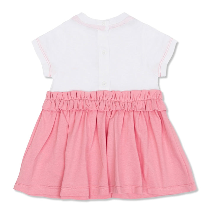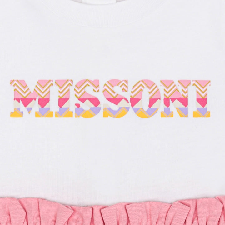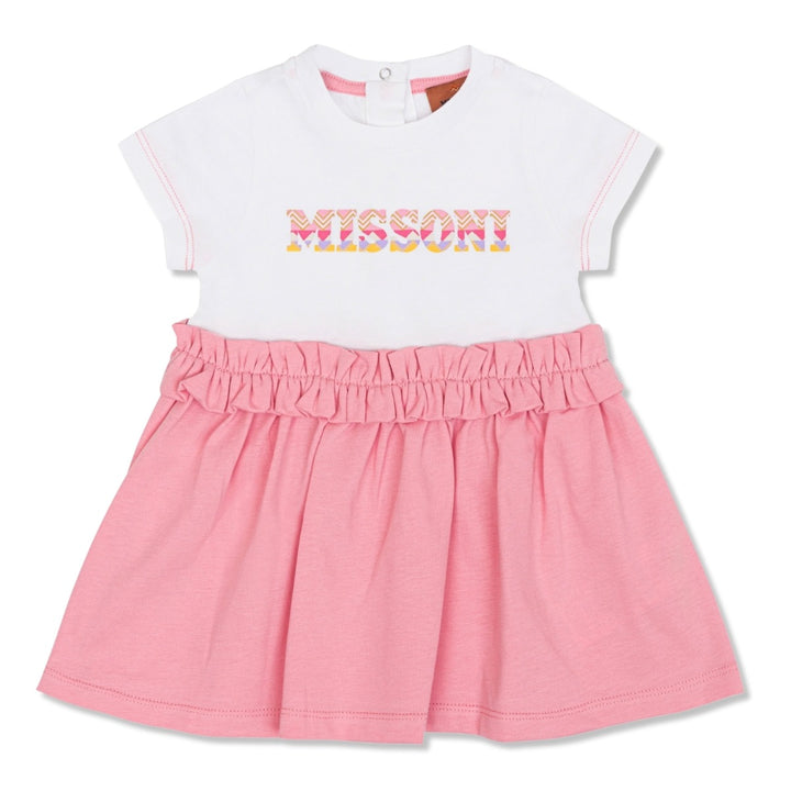 This Missoni baby girls' dress combines comfort and elegance with a playful twist. The top features a white cotton jersey fabric with a stylish Missoni logo print in a colorful zigzag pattern, adding a signature touch. The short sleeves have contrast pink stitching, enhancing the delicate details. The skirt portion is a soft pink with an elasticated ruffled waist, creating a charming, two-tone effect.