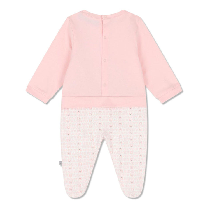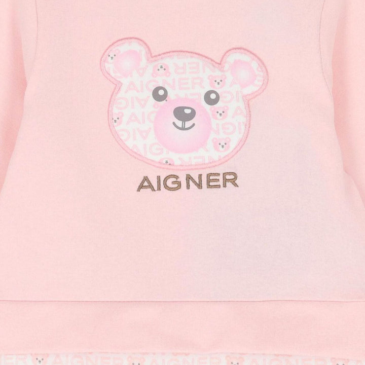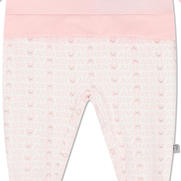 White and pink logo teddy bear babygrow for baby girls by Aigner. Made from soft cotton jersey for comfort. The front has a cute teddy bear face applique and embroidered logo, while the white bottom is patterned with a repeated pink brands name and t